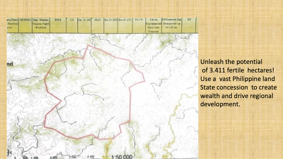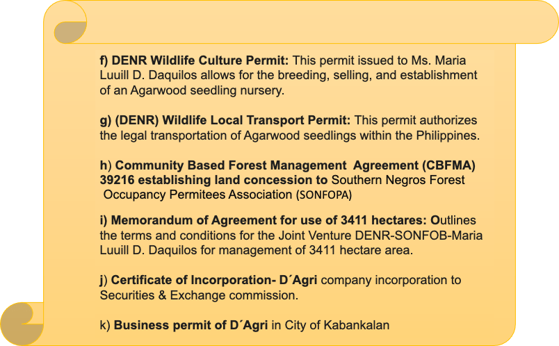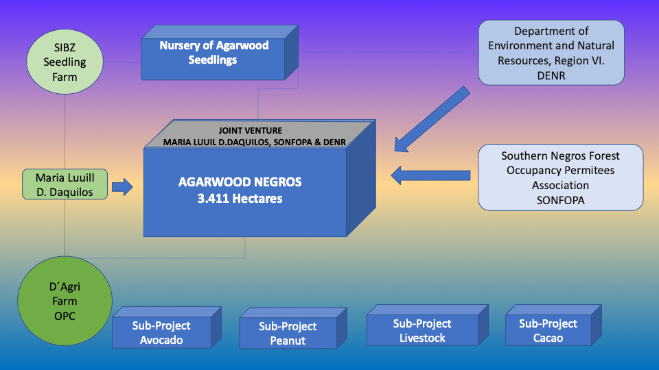 Structure and Project Organization : We not only have a concession of 3.000 hectares for 25 years (renewable) but the how we develop the project also depends on how strong and organized the structure of the project is. In our case we have a three party joint venture around the 3.000 hectareas. Having Maria Luuill D. Daquilos as Chief Executive Officer of D´Agri, having a farmer asociation, SONFOPA, as the labour force and also participating in the profit share and lastly and very important the Department of Environmental and Natural Resources from the Government of The Phillippines as supervisor and guarantee of the quality of the outcome of the plantation of Agarwood as well as the institution in charge of granting permits and overall surveillance of the quality and viability of the project.