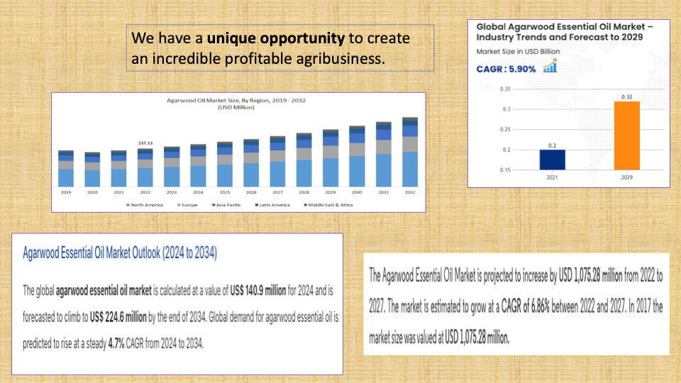 Imagine you are a group of farmers and you have more than 3.000 hectares to plant an incredibly valued tree, Agarwood, which can be harvested in 8 years at least and where you can also plant Avocado,and Cacao and have also livestock and Peanuts for the short term. You only need some funding and good and expert leadership, (Dagri leads the project), AND YOU ARE READY TO MAKE MILLIONS !! We are going to plant and sell the wood and oil of 2.000.000 Agarwood trees and the fruit of 600.000 Avocado trees plus hectares and hectares of Peanuts and hectares and hectares of livestock ! That`s how we are going to do it.